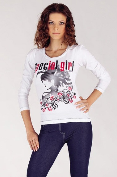 Лонгслив белого цвета с изображением девушки и надписью "Special girl". Облегающий покрой, рукава 3/4 и круглый вырез. Выполнен из хлопка.